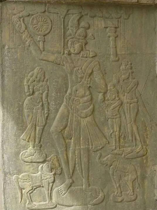 佛教转轮王的观念,受到印度孔雀王朝阿育王和贵霜时代丘就却(Kujula Kadphises, A. D. 50—78)与迦腻色迦(Kaniska, A. D. 187—212)的推动和改造,因此他们的做法成为后来佛教君主效仿的对象。(13)佛教对于王权的认识,主要是“一佛一转轮王”,佛或法师负责说法(法施),转轮王则负责供养(财施),正如佛教的出家僧尼和在家众(优婆塞与优婆尼)一样,一方面负责灵魂的引导,另一方面则提供物质回报。后汉西域三藏竺大力共康孟详译《修行本起经》卷上云:“夫人言:‘向于梦中,见乘白象者,空中飞来,弹琴鼓乐,散花烧香,来在我上,忽不复现,是以惊觉。’王意恐惧心为不乐,便召相师随若那,占其所梦。相师言:‘此梦者,是王福庆,圣神降胎,故有是梦。生子处家,当为转轮飞行皇帝;出家学道,当得作佛,度脱十方。’”