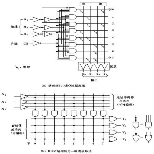 ROM的地址译码器是与门的组合,其输出是全部地址输入的最小项。可以把译码器表示成右图所示的与阵列,图中与阵列水平线和垂直线交叉处标的“点”表示有“与”的联系。存储单元体实际上是或门的组合,ROM的输出数即或门的个数。译码器的每个最小项都可能是或门的输入,但是,某个最小项能否成为或门的输入取决于存储信息,因此存储单元体可看成是一个或阵列。由上分析,可以从另一角度来看ROM的结构:它由两个阵列组成——“与”门阵列和“或”门阵列,其中“或”的内容是由用户设置的,因而它是可编程的,而与阵列是用来形成全部最小项的,因而是不可编程的。