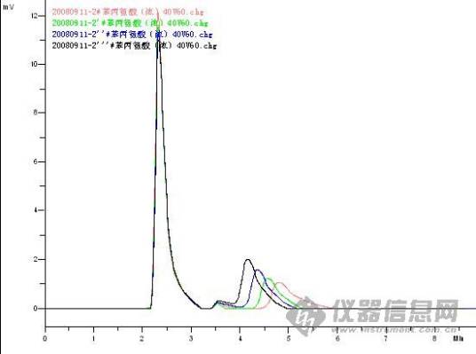 可能的原因:两个化合物共洗脱;可采用的排除方法:提高灵敏度,减少进样量,使温度降低10~20度,以使峰分开。