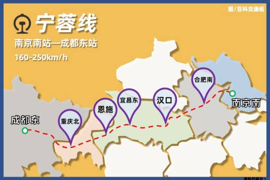 宁蓉铁路由南京南站至成都东站,全长1665千米,设56座车站,设计速度160-250千米/小时,运营速度160-250千米/小时。