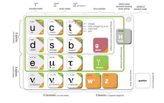 标准模型包含了十二种“味”的费米子。组成大部分物质三种粒子:质子、中子及电子,当中只有电子是这套理论的基本粒子。质子和中子只是由更基本的夸克,受强作用力吸引而组成。以下的标准模型的基本费米子: