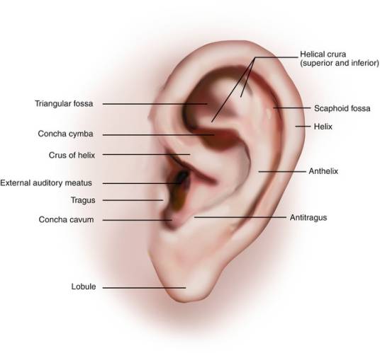 耳郭缺损:耳郭缺损多由切割、撕裂或感染所造成。撕裂伤应彻底清创,尽可能保存原组织,修复缝合和控制感染,常可得到良好效果。小缺损的畸形不明显,一般不须整复;须修复者应充分利用原有外耳组织,将缺损部的缺口边缘剖开,切成一个等边三角形,于三角顶的二方各切除较小三角形组织一块,然后将两端向中央拉拢缝合。较大的耳轮缺损,若对耳轮仍完整,则宜采用耳郭后侧面皮瓣滑行转移修复。若耳郭上部或中部缺损较大时,大都利用耳后区皮瓣和肋软骨作为修复缺损的材料。如耳垂缺损,可在与缺损部相对的耳后皮肤处,形成大小与耳垂相似的袋状皮瓣,造成一个新的耳垂。