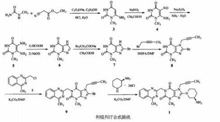 利格列汀化合物是商品名为利格列汀片药物的主要成分,化学名为8--7-(2-丁炔基-1)-3,7-二氢-3-甲基-1--1H-嘌呤-2,6-二酮;临床上该化合物合成的药物是属于一种新的有效的选择性二肽基肽酶-4(DPP-4)抑制剂,可用于治疗2型糖尿病。