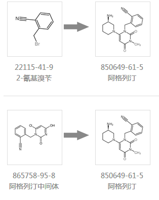 阿格列汀化合物是商品名为苯甲酸阿格列汀口服抗高血糖药物的主要成分,化学名为2 - -3-甲基-2,4-二氧代嘧啶-1-基]甲基]苄腈;临床上该化合物合成的药物是属于二肽基肽酶-4(DPP-4)的选择性抑制剂。具有抗糖尿病作用。