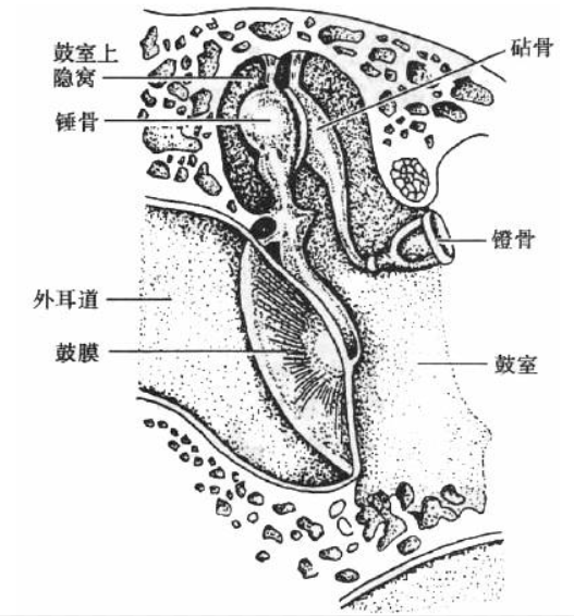 上鼓室(attic)又名鼓隐窝(epitympanum)、鼓室上隐窝(epitympanic attic),位于鼓膜紧张部上缘平面以上。下鼓室(hypotympanum)位于鼓膜紧张部下缘平面以下。中鼓室(mesotympanum)位于鼓膜紧张部上、下缘平面之间,大部分对应于鼓膜紧张部。后鼓室(posterior tympanum)位于鼓膜紧张部后缘以后,是中耳手术的重要部位之一。