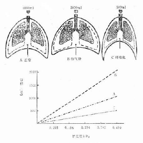 3.肺气肿 由于肺泡壁破坏,弹力组织减少,故静态顺应性增加;但肺气肿时,由于肺弹性减弱,对支气管环状牵曳力也减弱,病变部位支气管常易塌陷甚而闭锁,以致肺单位充气不均,出现动态肺顺应性减低。