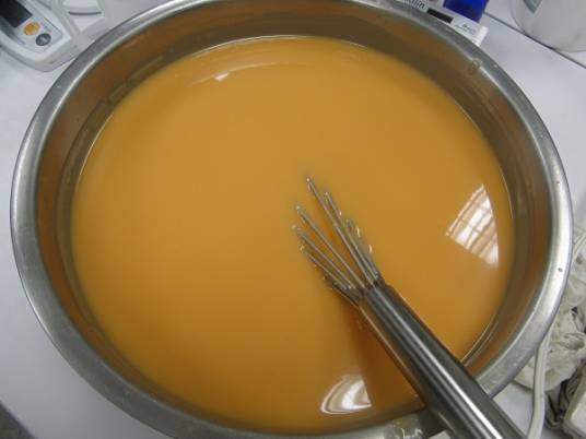 现象:在皂化锅中,充分搅拌并加热,油脂层逐渐减少,最后液体不出现分层,即说明皂化反应完成。