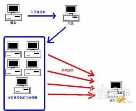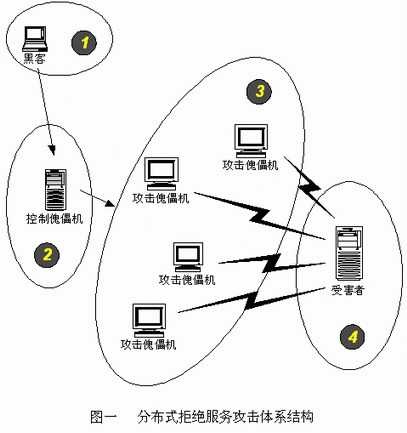在间接控制方式的攻击中,DDOS的攻击策略侧重于通过很多“僵尸主机”(被攻击者入侵过或可间接利用的主机)向受害主机发送大量看似合法的网络包,从而造成网络阻塞或服务器资源耗尽而导致拒绝服务,分布式拒绝服务攻击一旦被实施,攻击网络包就会犹如洪水般涌向受害主机,从而把合法用户的网络包淹没,导致合法用户无法正常访问服务器的网络资源 。