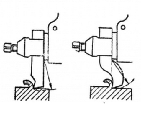 刨刀一般做成弯头形式,这是刨刀的又一个显著特点。弯头刨刀在受到较大的切削力时,刀杆所产生的弯曲变形,是绕O点向后上方弹起的,因此刀尖不会啃入工件;而直头刨刀受到变形易啃入工件,将会损坏刀刃及加工表面。