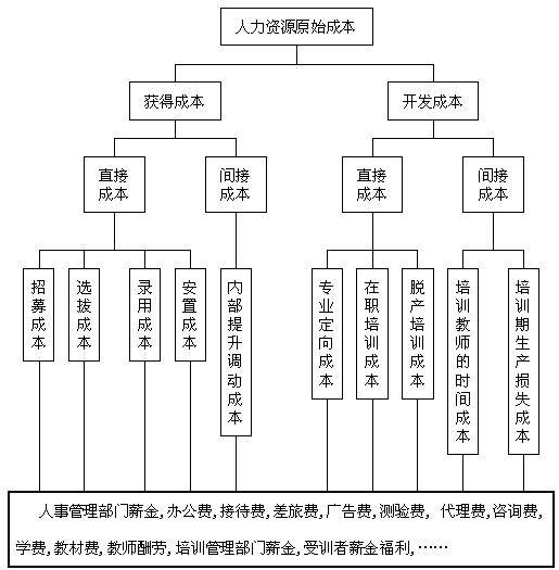 人力资源原始成本的计量。人力资源的原始成本包括人力资源的取得成本、开发成本和使用成本。这三种成本均为历史成本,有明确的记录可查,容易计量。其中取得成本包括招募成本、选拔成本、录用成本和安置成本;开发成本主要包括上岗前教育成本、岗位培训成本和脱产培训成本;使用成本包括维持成本、奖励成本、调剂成本等。