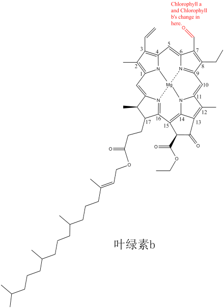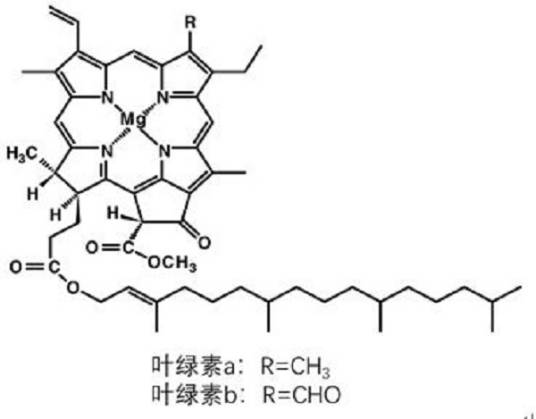 叶绿素b | 高等植物、绿藻、眼虫藻、管藻 | 红光和蓝紫光 |