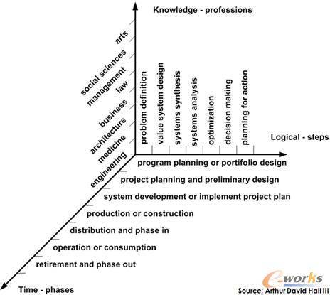 系统工程的步骤和方法因处理对象不同而异。对一般步骤和方法的研究比较有影响的是美国贝尔电话公司系统工程师A·D·Hall于1969年提出的三维空间法:(一)时间维。表示工程活动从规划到更新阶段按时间顺序安排的7个阶段,即规划阶段;拟定计划方案阶段;研制阶段(并制订生产计划);生产阶段(生产系统零件、提出安装计划);安装阶段;运动阶段;更新阶段。(二)逻辑维。指完成上述7个阶段工作的思维程序。包括:明确问题,即搜集本阶段资料,提供目标依据;系统指标设计,即提出目标的评价标准;系统综合,即设计出所有待选方案或对整个系统进行综合;系统分析,即运用模型比较方案,进行说明;实行优化,即从可行方案中选优;进行决策;实施计划。(三)知识维。完成各步工作需要的各种知识、技能。