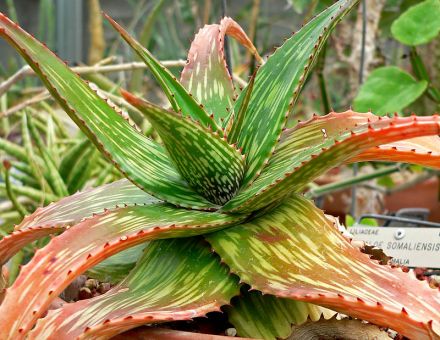 索马里芦荟是一种无茎或短茎芦荟,青绿色剑形肉质叶呈轮状,带有许多白色线状长圆形不规则斑点,边缘有硬质的三角形棕色小齿。树叶长(12-)16-17(-20)厘米,压缩的玫瑰色,蔓延或上升,肉质,披针形剔骨,倾斜,尖端下弯,两侧基部凸起,上表面凹槽,约20-30(-40)厘米长,底部宽6-8厘米,有光泽的深绿色,通常带褐色,有许多白色线形长圆形不规则斑点,深绿色斑纹,下面较淡,有更多斑点,表面光滑。边缘有强壮的三角形棕色牙齿c。4毫米,刺鼻,红褐色,相隔8-10毫米。树干干燥棕色。