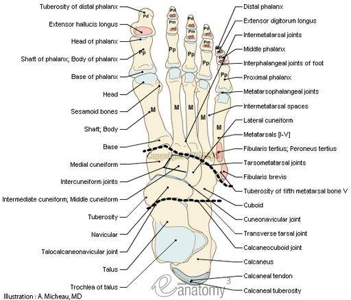 1、距骨2、足舟骨3、中间楔骨4、内侧楔骨5、跖骨6、趾骨7、跟骨8、骰骨9、外侧楔骨