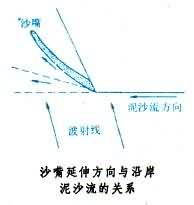 夹角为45°时,波浪对泥沙的搬运能量最大;夹角偏离45°时,波能对泥沙的搬移能力随之减小,泥沙沉积形成沙嘴(见图)。在不同的岸段上,沿岸漂移的沙砾数量不同,则分别在湾口、湾中或湾顶形成沙嘴。沙嘴向海伸长的速度随水深增大而变慢。它的末梢因受来自外海的波浪作用,向陆弯曲。在岬角被侵蚀和后退过程中,伴生复合状的弯曲沙嘴。此外,在河口也常有沙嘴发育。 在陆地与岛屿之间的波影区内,泥沙在波影区内堆积,形成由陆朝向岛屿、由岛屿朝向陆地,或者由两者结合的单、双连岛沙洲,如中国山东芝罘岛的连岛沙洲。