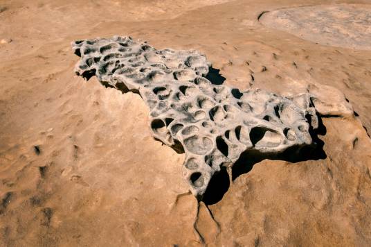3.海水的盐分继续进行崩解作用,逐渐将小洞扩大,形成蜂窝形状。