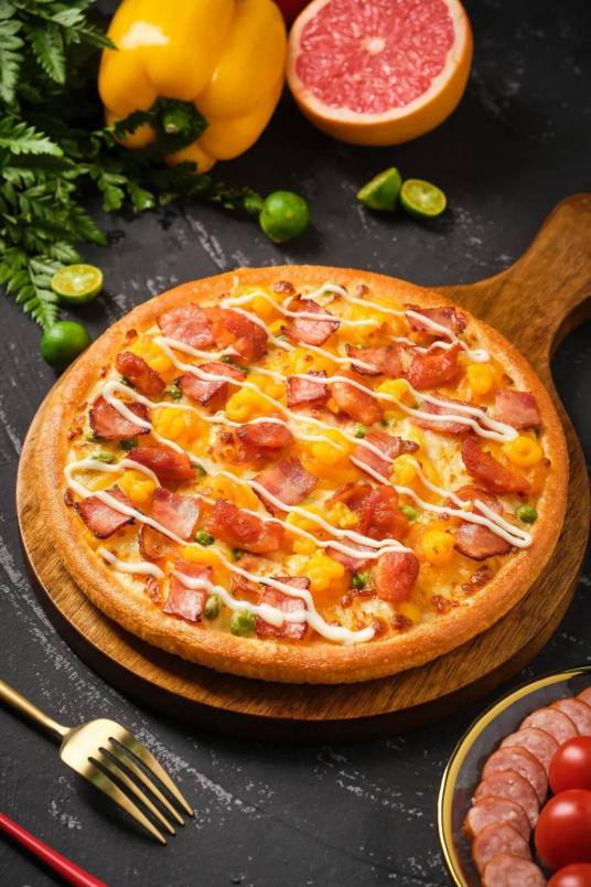 推荐做法:蔬菜培根用洋葱、青椒、豌豆、玉米、培根;水果培根用草莓、菠萝、培根。也可以在上面再撒一些酱料。