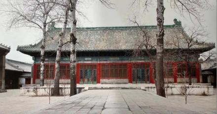 正寝殿 正寝殿又称神殿,面阔七间,进深九歇山顶,绿琉璃瓦屋面。檐下施以重昂五踩斗拱。额枋绘墨线大点金旋子彩画,金龙枋心,贴金团龙井口天花。殿前建有月台,月台的三面建垂带踏跺。正寝殿的东西两侧建有朵殿各三间 。 |