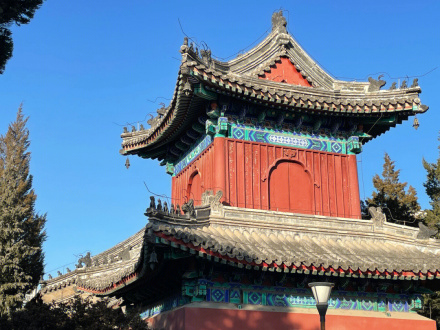 藏经楼 藏经楼位于第四进院北侧,面阔七间,进深七檩,二层,前后出廊,硬山顶调大脊,筒瓦屋面,排山勾滴,额枋绘墨线大点金旋子彩画,上层前檐装饰有寻杖栏杆,下有挂檐板。两侧山墙内各有楼梯可通上层。院内东西配殿各五间,前后出廊,硬山顶调大脊,筒瓦屋面,排山勾滴,额枋绘墨线小点金旋子彩画,槅扇门、窗。北侧有东西庞房各七间 。 | |