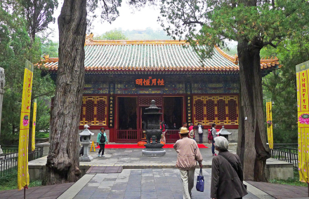 | 木牌楼 木牌楼为四柱三楼式,简瓦屋面,额书“智光重明”。木牌楼后为长百余米的林荫道 。 |