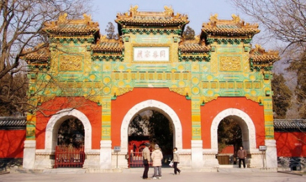 琉璃牌楼 | 琉璃牌楼 琉璃牌楼位于林荫道后,为三间四柱七楼式,绿琉璃瓦黄剪边屋面,额书“同参密藏”和“具足精严” 。 |
