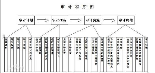 审计程序是审计工作从开始到结束的整个过程。一般包括三个主要的阶段,即计划阶段、实施审计阶段和审计完成阶段。主要工作包括:调查了解被审计单位的基本情况;与被审计单位签订业务约定书;初步评价被审计单位的内部控制;确定重要性水平;分析审计风险;编制审计计划,对被审计单位内部控制进行控制测试;对会计报表项目进行实质性测试;整理、评价执行审计业务中收集到的审计证据;复核审计工作底稿;形成审计意见,编制审计报告。
