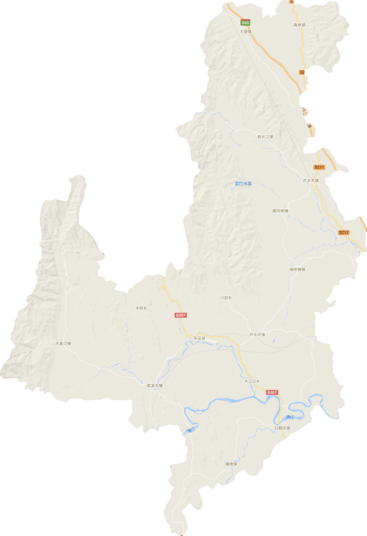 东安县,地处越城岭与都庞岭之间谷地、越城岭与零祁盆地过渡带, 地势西北高,东南低,由舜皇山区向湘江河谷倾斜,河网密布,水系呈树枝状从西北向湘江汇集,分属两大水系,即南部的湘江水系和北部的资江水系。地形多样,以山地为主,山地、丘陵、岗地、平原交错分布。