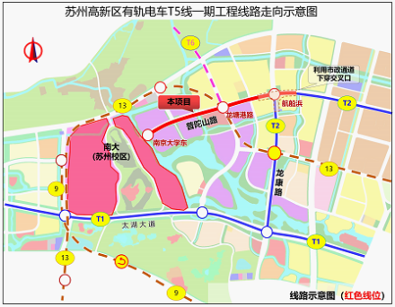 线路配套设置有变电所、机电设备和车辆。T5线一期工程是服务南京大学苏州校区与创新发展片的通勤线路,可为近期集中启动区提供便捷、高效的公共交通服务。同时也是太湖科学城对外沟通的重要公交线路,通过衔接高新有轨电车T1线、T2线,直达苏州新区火车站、主城区。