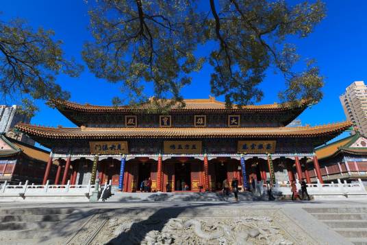 | 大雄宝殿 殿内供奉五方佛造像,东西两侧供奉二十四诸天,后侧供奉海岛观音、善财童子和龙女。殿内梁柱悬挂五副楹联。大兴善寺为中国汉传佛教密宗祖庭,在密宗里,供奉的主尊佛是“五方佛”。“五方佛”又称“五智佛”、“五智如来”,代表中、南、东、西、北正方。 大殿最上悬挂“大雄宝殿”牌匾,为赵朴初题写。其下悬挂三副牌匾:正中为“五方五佛”匾,传印法师题写;东侧为“丕振宗风”匾,陕西省佛教协会和西安市佛教协会合赠;西侧为“光大法门”匾。廊柱悬挂四副楹联。殿后亦悬挂四匾。最上为“真空妙有”匾额,其下三匾:正中为“般若法门”匾,中国道教协会会长任法融题写;东侧为“名山得主”匾,北京广济寺方丈演觉法师题写;西侧为“万德庄严”匾,广东省佛教协会会长明生法师题写。 |