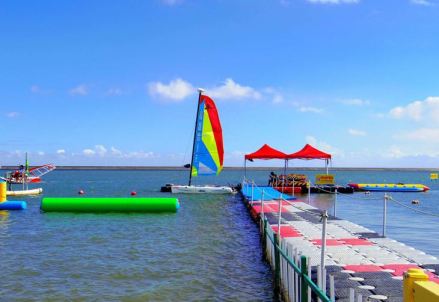 | 奉贤碧海金沙水上乐园 总面积2.81平方千米,其中沙滩区1.3平方千米,是中国最大的人造沙滩。景区拥有30米宽的海边树林、6万平方米游泳区,还有卡丁车、水上自行车、水上三轮车、步行球、沙滩摩托车、皮划艇等娱乐设施,2008年被评为国家AAAA级旅游景区。2012年,碧海金沙核心景区基础设施进行了全面修缮,包括沙滩重新铺砂整理、500米长廊整修、水上舞台重新装修等,同时还增加了海龟馆、海上高尔夫等项目,并在景区门口设立了公交车和出租车的候车点。 |