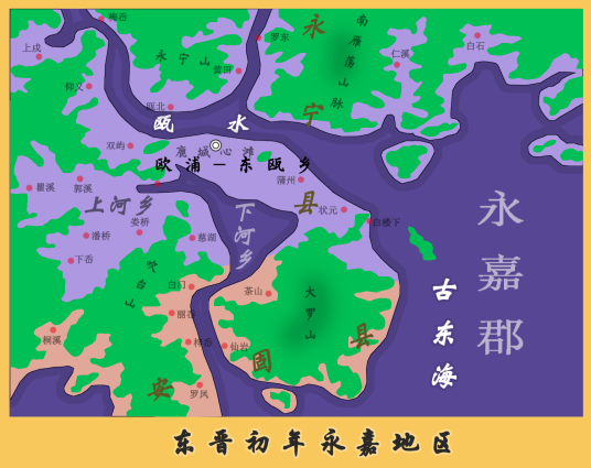永嘉郡,古郡名,东晋明帝太宁元年(323年),析临海郡温峤岭以南地区置永嘉郡,辖永宁(今温州四大主城区、永嘉县、乐清市一带)、安固(今瑞安市、文成县、泰顺县一带)、横阳(今平阳县、苍南县一带)、松阳(今丽水除遂昌一带,因松古平原是东瓯、姑蔑陆上通衢,因此县治设在松古地区,即今松阳县一带)四县。治永宁,建郡城于瓯江南岸。这是温州地区最早由中原王朝官方划定的独立建制。