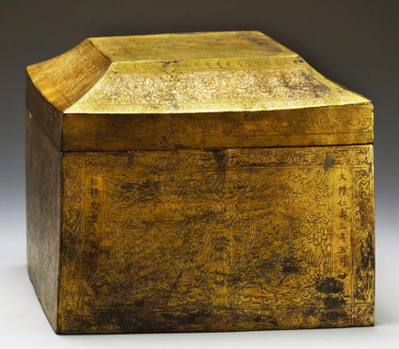 鎏金铜函边长23.2~23.5厘米,高19.5厘米。函方形,平底。上有盝顶式盖,通体錾凿,阴文,表面鎏金。盖面为护法,四面为菩萨及护法,每面两尊,花纹主题为佛教故事。铭刻为:“大隋仁寿三年五月廿九/曰静志寺与四部众修理/废塔掘得石函奉舍利有/四函铭云大代兴安二年/十一月五日即建大塔更/作真金宝碗琉璃等瓶上/下累叠表里七重至大业/二年十月八日内于殿内”,铭文与图案互相间隔,由铭文可知,隋代仁寿年起塔发现了北魏文成帝时代的小舍利石函,而此北魏石函和隋代舍利函,竟都如此完好的保存至今。隋代石函和鎏金铜函与此外一件盖形石志、一鎏金银碗、一鎏金银塔、绿、白相套的二玻璃瓶,组成了一套“上下累叠,表里七重“的舍利容器,实物发现与鎏金铜函上的铭文记载可一一对应。