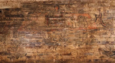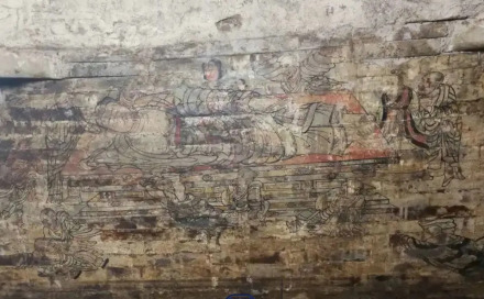北墙的壁画内容是释迦牟尼涅槃成佛图,简称卧佛图。他双眼闭合,表情慈祥,右手手托后脑,头朝西,脚朝东悠然的躺在佛台之上,周围有12个弟子以及一个皇帝,佛台最左边和最右边的俩个弟子在跳舞祈祷。左下角的两个弟子,一个早已哭晕过去,另一个抱着他也是泣不成声。紧接着往右的这个弟子跪在地上,双手搭在佛台边沿,低头痛哭不止。佛台中间这位弟子瘫坐在地上抬头仰望着释迦摩尼慈祥的脸颊,右手托着下巴,左手五指紧握拳头死死的按在了自己的小腿上,双眼噙满了泪水。再往右的这位弟子仰坐在地上,面朝师父,双拳紧握,似乎在来回的捶打着自己的胸部,嘴张的很大,哭叫声想必也很大,俩眼的热泪飞涌而出。