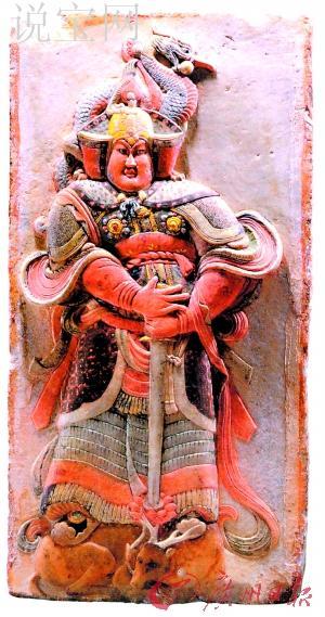 浮雕武士石刻其中一个武士身着戎装,顶盔贯甲,怒目圆睁立于牛身之上,肩和头部卧一只凤凰。武士手握宝剑,剑尖指向卧牛口中的荷花。雕像用红色、赭石、黄色进行了彩绘。另一尊武士浮雕像,脚踏麋鹿,手握宝剑,剑尖指向麋鹿口中的荷花,肩上青龙盘卧,龙首爬上武士头顶。两块武士浮雕的形象是中国民间传说中的门神:唐太宗时期的大将秦琼叔宝和尉迟恭敬德。