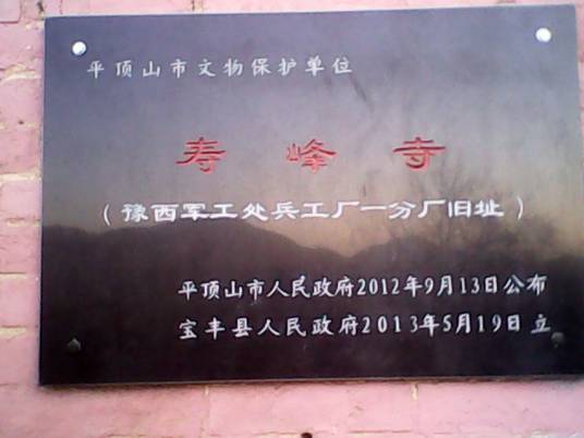 寿峰寺位于大营镇李坪村后窑,是原豫西军工处兵工厂一分厂旧址。寺院石碑记载,于清朝康熙和清朝道光25年两次重修。寺院创建时间无从考证。
