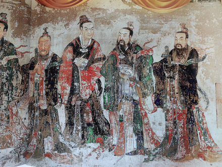 真武庙正殿抱厦内东、西两壁上皆绘道教题材壁画,壁画内容为“星君捧笏朝拜图”。画上的人物均高1.5米左右,东西各画七位星君,手持笏板,神态各异。星君均表现为面朝主神真武大帝而行,其前面各有引导人物:东壁为金童、西壁为玉女,各手持宝幡为前导,回首引领一位尊者,尊者后为侍童。尊者手捧笏板,向北朝拜真武大帝。金童玉女手中各捧一盘,金童盘内为一轮红日,日中立一只公鸡;玉女盘内为一轮黄月,月中卧一只白兔。壁画中的人物衣着设色各异,神态自然。