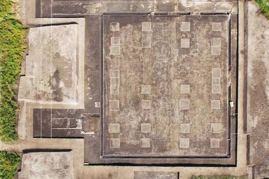 9号建筑基址位于太子城遗址南门北部,城址南北中轴线上,正对南门,南距南门约75米,面阔三间,进深五间,南北29.2米、东西26.2米、残高0.35米,在基址范围内分布南北4列共30个边长1.6—1.8米的方形磉墩,从西往东数量分布为9个、6个、6个、9个,基址四周有基槽,槽宽0.6—0.7米,基槽内砌砖,在基址的东、西、北分别有宽4米、4米、4.5米的踏道通向基址上部 。