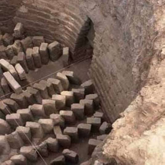 4号窑里是砖坯,还没有烧成砖,就被封上了。砖窑窑口南北长4.2米,东西长3.8米,窑口到窑床的深度为2.5米,窑口到火膛的深度为3.5米。砖窑的窑门形制完好,窑门向窑内添柴的沟槽清晰可见。窑床上规律地码放着10行东西走向的砖,砖共100余块,全部竖放,砖行之间是用来走火走烟的烟道。考古队员们从烟道里发现了厚约5~10厘米的烟层以及一些没有充分燃烧的小木柴。