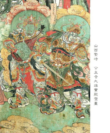 公主寺的水陆画在大雄宝殿内,东、西壁水陆神衹分四层,中间主尊佛及其下背面比丘外,其余均面朝中间,大体沿中轴线对应。东壁中间绘卢舍那佛。结跏趺坐须弥座上.双手作转法轮印,其下一弟子长跪,背面,作启奏状。可能是宾头卢尊者。最上层南侧依次为天龙八部、十八罗汉。十地菩萨。天藏菩萨,天仙神众;北佣榜题依次为天龙八部.十八罗汉、十地营萨。持地菩萨、 天仙神众。中上层南侧榜题依次为观音菩萨、文殊菩萨,斗牛女虚危室壁、大药刹神众。五瘟使者:北侧榜题依次为势至菩萨.普贤菩萨、奎娄胃昴毕觜參,中下层南侧榜题依次为金刚座神.日光天子,角亢氏房心尾期(箕),扩野大将军、主苗主林主病主药、三灵侯圣众;北侧榜题依次为金刚座神、月宫天子。井鬼柳星张翼轸、护斋护戒护法之神.安济夫人陵(灵)肃山镇江王顺济龙王众,雷电风伯众。最下层南侧榜题依次为大梵天主、四大天王众。东岳南岳中岳并从春等,西岳北岳一切神衹众.四海龙王众。