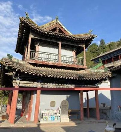 | 黄箓宝坛玉皇楼 黄箓宝坛玉皇楼又称凌虚楼,为二层楼阁式建筑,砖木结构,重檐歇山顶,面阔三间,进深三间,平面呈正方形,斗拱为四铺作,殿顶为琉璃脊饰,琉璃剪边。上层为玉皇楼,内塑玉帝像。下层为灵官殿 。 |