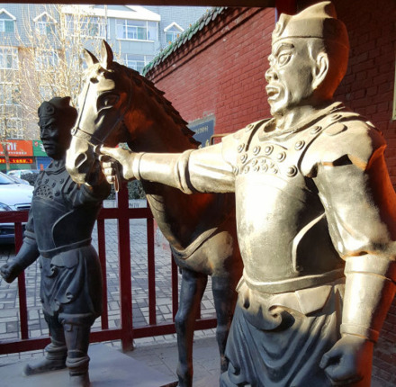 关公铜像威猛凛凛,无标注铸造年代,据清代知事王公式昌先生考证,应当铸于明万历之前,而汾阳关帝庙的别称“铁马老爷庙”,便由此而来。1956年秋,关公铜像运至太原,现铁像存于太原纯阳宫内。