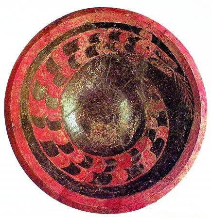 大型墓出上的彩绘木器,构成陶寺类型文化的另一特色。这些木器的胎骨都已朽没,依靠残存的彩绘颜料层得以剔剥出原来的形状,已知有案、俎、几、匣、盘、斗(勺)、豆、“仓型器”、鼓等多种器形。木鼓均成对,与一件大型石磬(特磬)同出。鼓腔作直筒形,高1米,直径0.4~0.5米,系树干挖制而成,外着红彩或以红色为地,用黄、白、黑、蓝诸色描绘出繁褥的纹饰。由散落在鼓腔内的鳄鱼骨板得知,当初是以鳄鱼皮蒙鼓,即古文献中所称的“鼍鼓”。