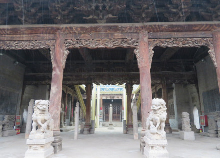过殿,面阔五间,单檐硬山卷棚灰瓦顶,柱头科、平身科斗拱五铺作,阑额雕刻缠枝牡丹花卉,柱础由上下两块石头组成,上部为鼓镜式,下部为上雕覆莲的方石处。