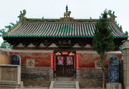 山门,单檐悬山,琉璃瓦顶,檐下斗拱为三踩单昂式。前檐明间为板门,两次间各置元代石窗。门前有石踏跺三级。