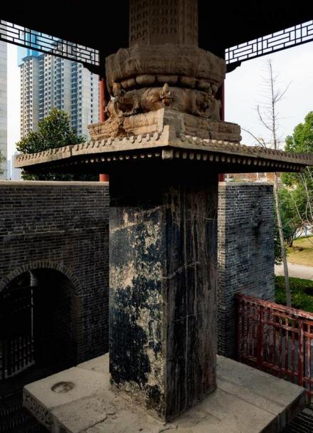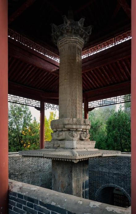 彼岸寺碑,又称“彼岸寺经幢”“龙塔古篆”,为明清郾城八景之一。彼岸寺碑通高12.18米,由底盘、基座、篆文碑、造像碑、顶等构成,除顶部为砖石结构外,其余构件均为青石雕琢对接而成。