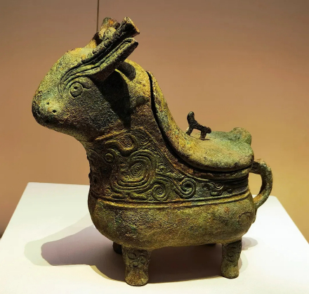牺觥,二器成对,通高21.2l厘米、长21.8厘米。形似四足兽,兽首与身相连,吻部方正,兽身圆角长方形,身后附龙形鋬;兽背负盖,弧脊翘尾,上立小兽状纽,扁蹄足。器身饰宽带纹,以云雷纹衬地,主题花纹为两侧对称的大风鸟纹,后随一长尾凤鸟,两鸟大小相差悬殊,主从明确。颈下辅饰四组简化夔纹。兽蹄足的跟部饰象纹。这两件牺觥的造型和风格,经过剖析,是越人的仿古之作。