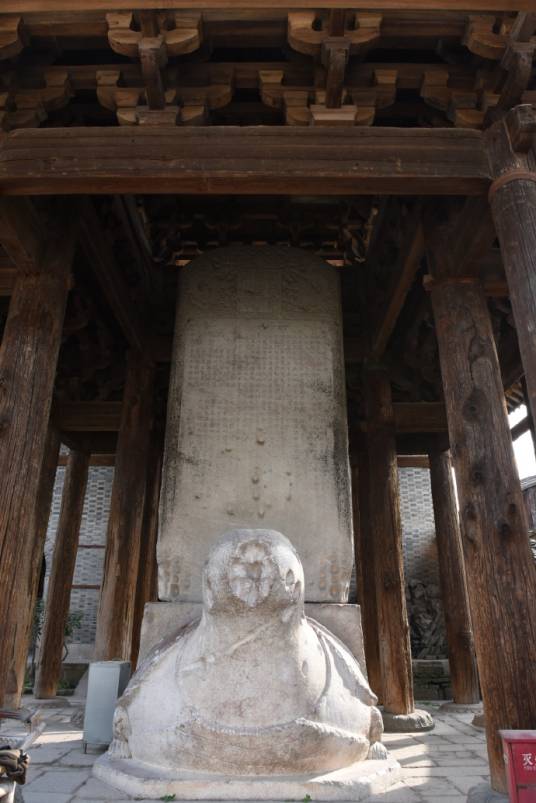 据《徐仙真录》载:“永乐十五年(1417年)正月二十八日钦奉旨着都指挥童俊、按察司副使许升重新起盖。……本年四月二十六日兴工,次年五月初六日完成,继于南京凿石碑并龟趺,航海而来,仍集军夫万人建立其奉。”《明实录》记述:“凿石碑与龟趺当年是三宝太监郑和下西洋船队奉旨护送而来,这只象征吉祥的庞然大物,足有万斤之重。”《闽都别记》第270回有这样一段记载:其石龟运至灵济宫,将已立之碑卸下,在此龟背上凿孔,将碑抬上龟背竖立,竟抬不上,搭天车,亦不能上。弄至二日不得成立,皆以龟大而高,又光滑,人不能立脚,正无主意间……如何立碑难倒了当差的工匠。正当大家一筹莫展之际,一位旁观的老者悟出了“若要石碑立,除非不见龟”的道理:“可先挑运土块石头,将龟堆埋土中,只露脊背凿孔,四旁皆堆土,果不见高,又有立脚之地,待碑立了,再开除去土,龟便现出。神汝如此行动始能成功也”。众人便依此法行事,终于将碑立了起来。