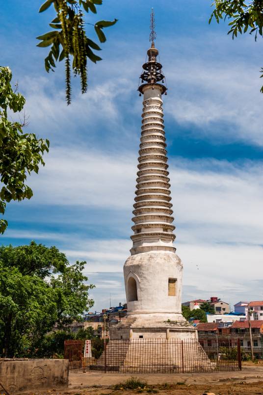 塔刹对于覆钵式塔而言也称“十三天”,“十三天”为覆钵式塔的重要标志,立于覆钵之上,分别由塔脖子、刹杆相轮、宝盖、利刹冲天戟四部分组成。塔脖子:在塔刹底部,相似于须弥座,底部和顶部装饰线对边分别宽3.02米,每边分别宽1.25米,通高0.74米。塔脖子上方用异形青砖出檐二层共0.22米,一层四周为齿轮形,二层四周为圆形。刹杆相轮:造型为砖砌刹杆贯串相轮。何为相轮,是指套贯在刹杆上的圆环,早期称作金盘,承露盘。相者,表相。表相高出,谓之相。概况起来相轮就是作为塔的仰望标志,以产生对佛的崇高敬仰之意国。文风塔刹杆通体相似于圆柱锥形,相轮相似于宝盖形。整个塔刹按二十一层相轮递缩收砌至刹顶。刹身底部截面直径2.78米,顶部截面直径0.9米。底层相轮直径3.14米,顶层相轮直径1.22米。宝盖呈覆盘式共三个,由大到小贯套刹杆顶部,刹杆尖端安装宝珠。宝盖直径分别为1.56米、1.28米、1.05米,厚分别为0.05米。宝珠直径0.57米,其中中层、上层宝盖面上有八个对称式长方形椭圆形孔洞,三个宝盖四周安装八个风铃。宝珠周围有四个环,是固定宝盖的装置。