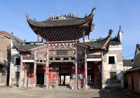 祠门厅为马头硬山建筑,以木板隔成大门壁,共有三樘双开大门。正中大门上悬挂的是“进士”匾额;大门两边挂有一幅对联:上联是南齐将军大唐状元之后,下联是炎宋翰林有明进士之家。两侧大门上分别挂的是“讲信”“修睦”的匾额。