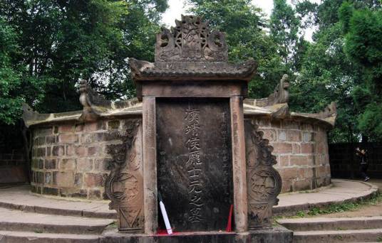 步出栖凤殿后墙的两侧耳门,庞统的墓园就出现在眼前。墓顶为石雕镂空宝顶,下压八角凤尾;墓体为石箍圆柱实体,总体宛如一顶巨大的将军盔。庞统墓的外观造型与庞统的身份十分相符,在名古墓中堪称一绝。听说前来参观凭吊者,手摸墓顶石雕角檐3下,再摸自己头顶并绕墓3圈,会免灾除病,许愿会显灵。